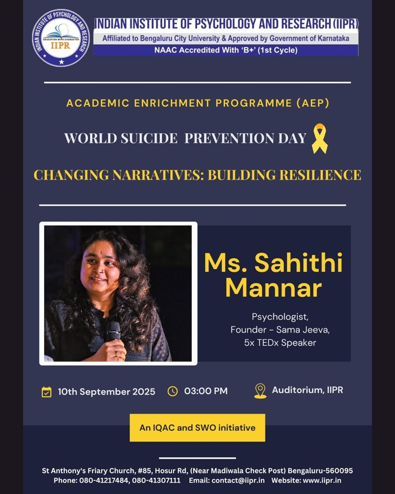 Our sincere appreciation to Ms. Sahithi Mannar, trauma-informed psychologist, founder of Sama Jeeva Foundation, and certified QPR Instructor, for her powerful session on "Changing Narratives: Building Resilience." Her expertise and compassionate approach offered our students meaningful perspectives on the role of psychology in prevention, awareness, and resilience-building.